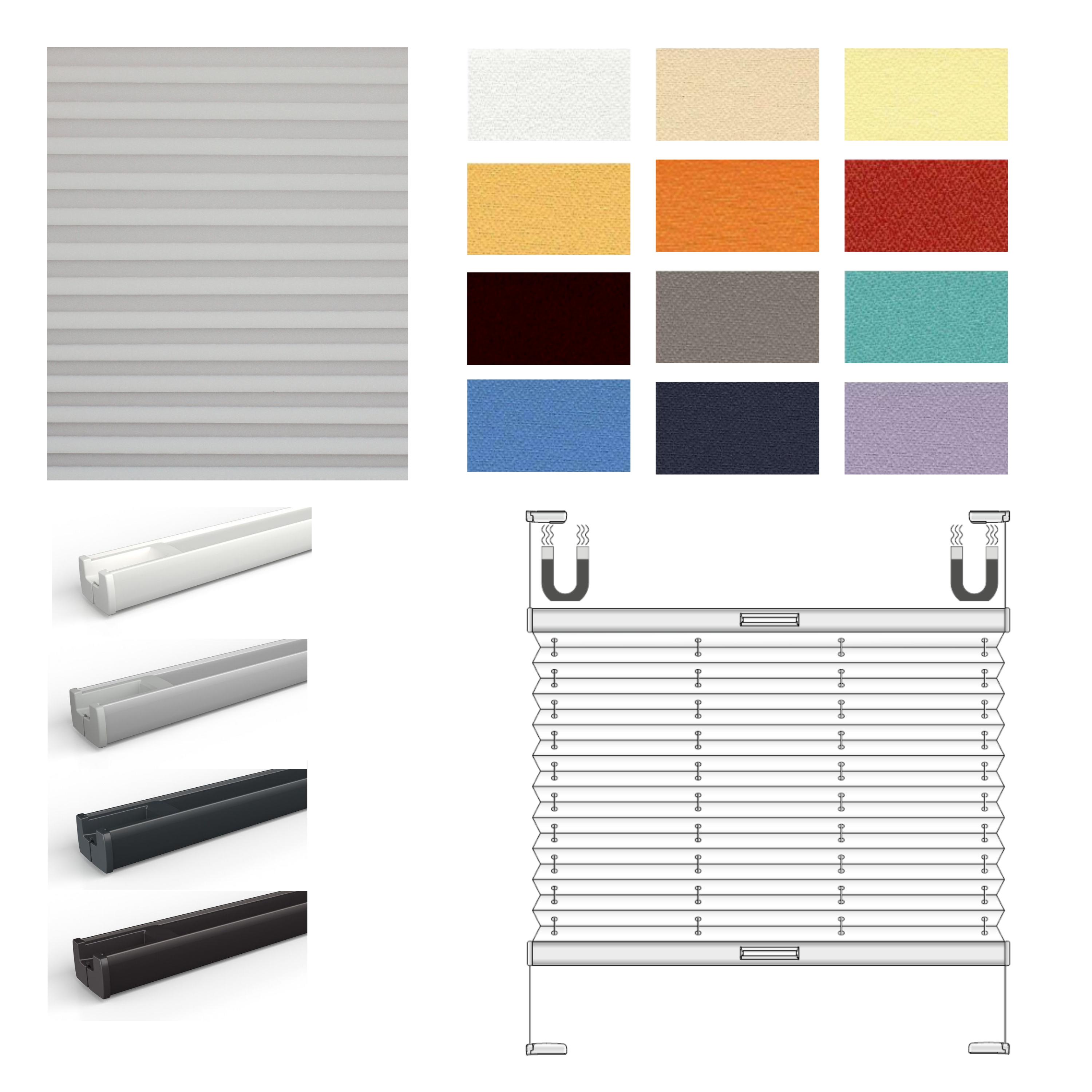 Das Plissee fertigen wir millimetergenau nach Ihren Angaben, beachten Sie hierzu die Aufmaßinfo. Als Technik kommt das hochwertige Cosiflor©-System zum Einsatz. Sie können das Plissee mit beiden Profilen mit Griff in alle Richtungen bewegen. In dem oberen Profil sind Magnete zur Fixierung in der oberen Position integriert. Das verhindert ein herunterrutschen der Plisseeanlage. Wir liefern das Plissee komplett mit dem benötigten Montagematerial zum Schrauben in den Fensterfalz und einer ausführlichen Montageanleitung.- messen Sie Ihr Fenster Anhand der Beschreibung Aufmaß