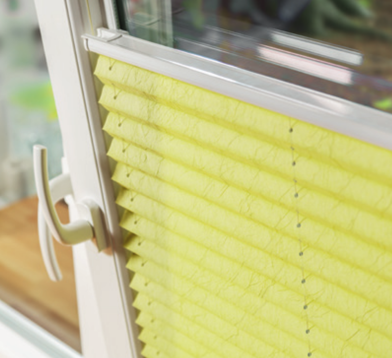 Der Plissee-Modelltyp VS2 KL wird ohne bohren, mit Hilfe von Klebeprofilen, am Fenster montiert. Die Profile werden direkt auf das Fensterglas neben die Gummidichtung geklebt. So lässt sich auch ein seitlicher Lichteinfall gut reduzieren .